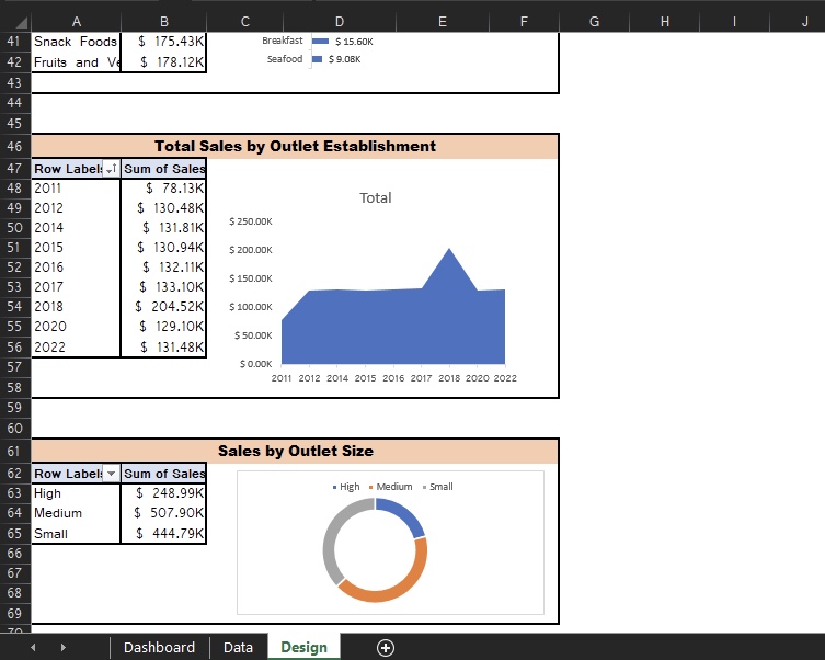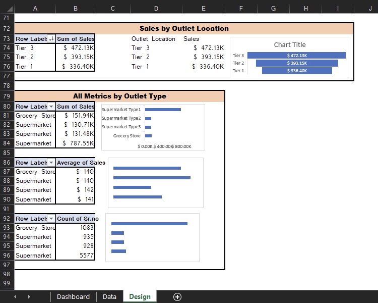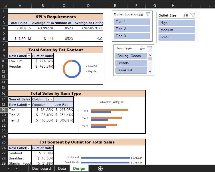 - Objective: Provide a comprehensive view of all key metrics (Total Sales, Average Sales, Number of Items, Average Rating) broken down by different outlet types.