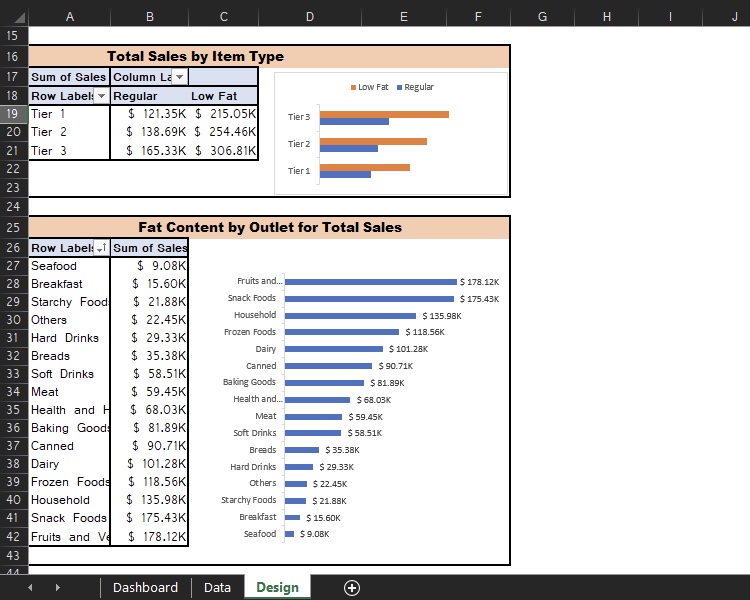 . - Additional KPI Metrics: Assess how other KPIs (Average Sales, Number of Items, Average Ratings) vary with item type.